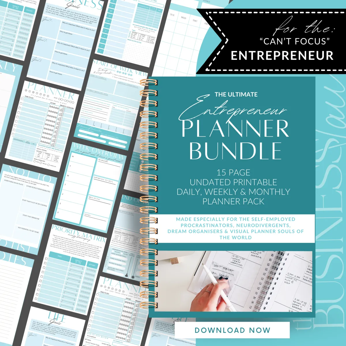 The Entrepreneur Planner Bundle has everything you need to organise your business, stay focused, and keep momentum moving forward.